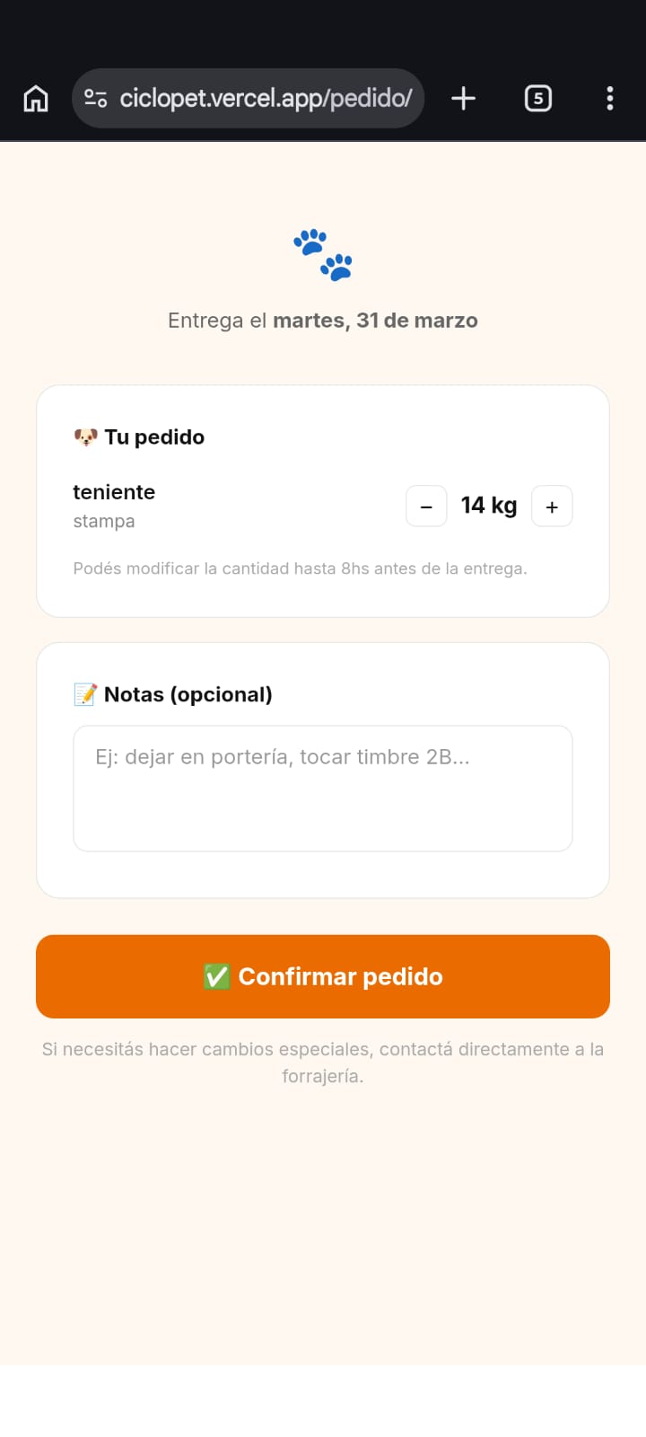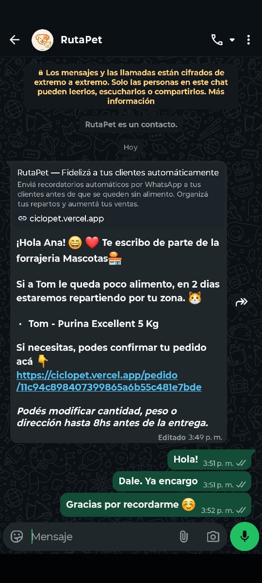 RutaPet avisa automáticamente por WhatsApp cuando a cada mascota le está por terminar el alimento. Tus clientes confirman el pedido y vos arrancás el día con la hoja de ruta lista.
